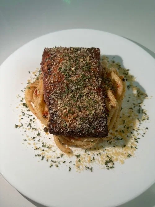 Remove salmon from pan and serve with bucatini pasta in a tomato garlic and caper sauce. Garnish with Italian parsley and grated parmigiano reggiano.